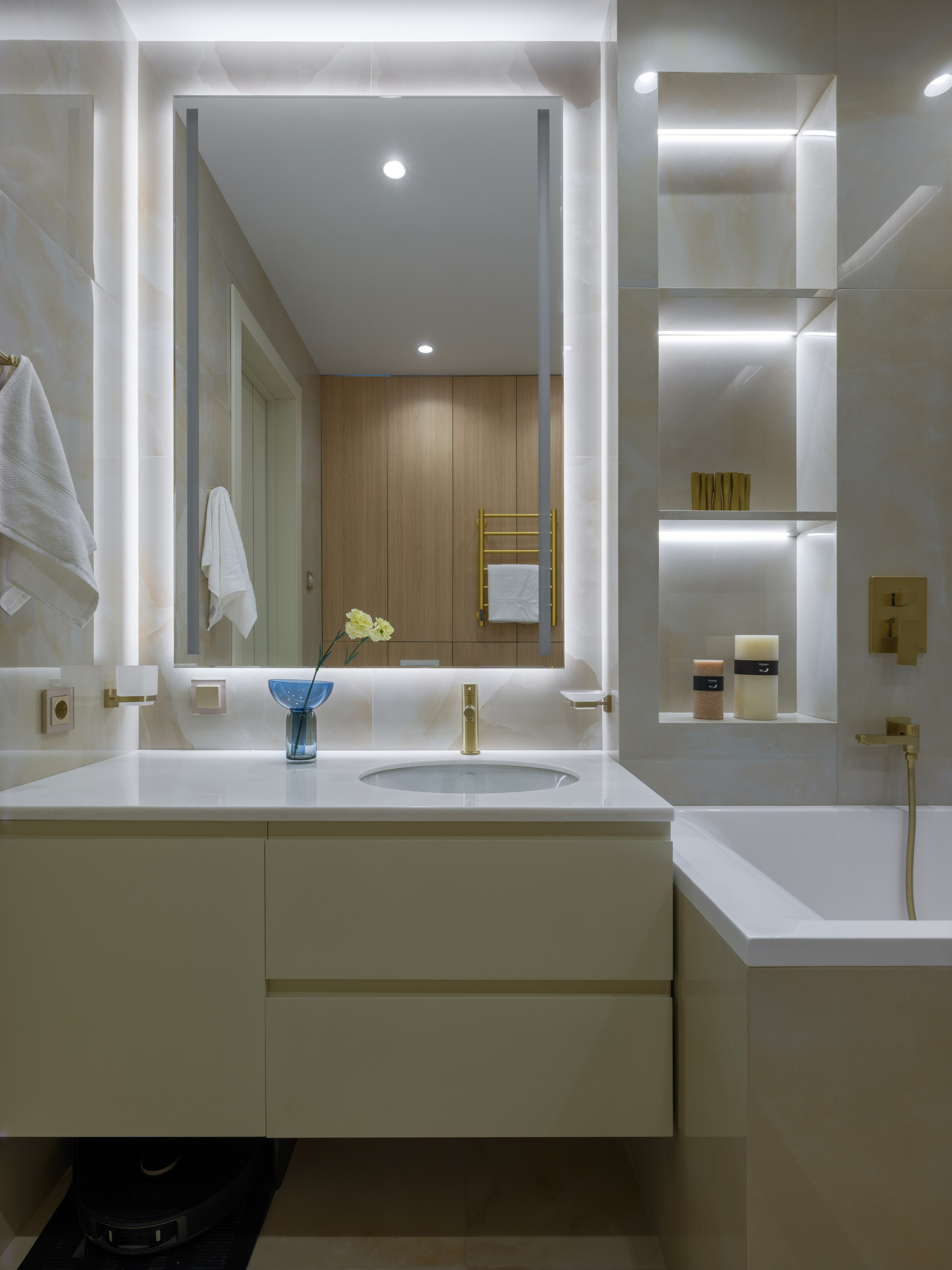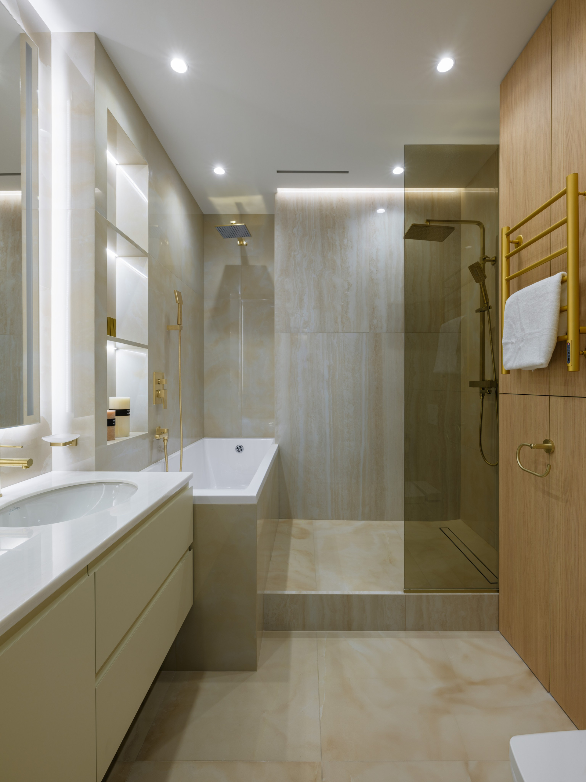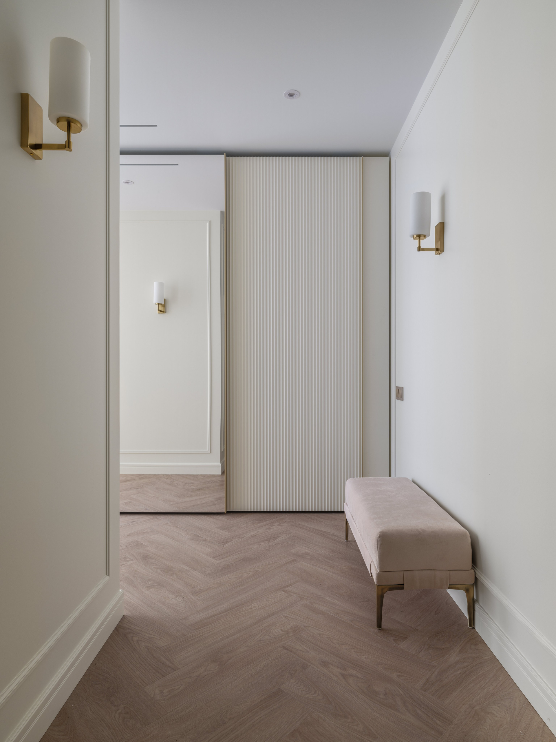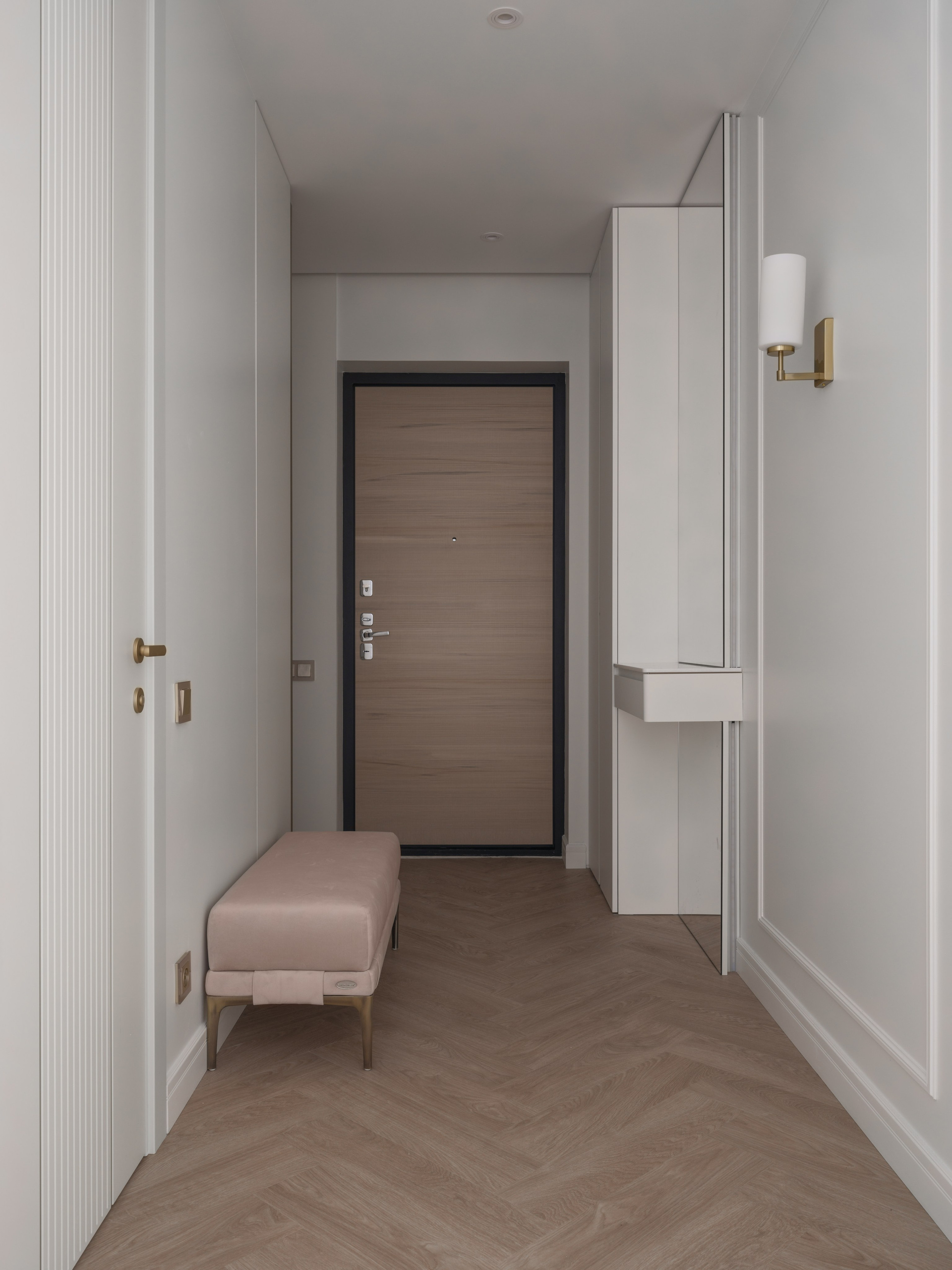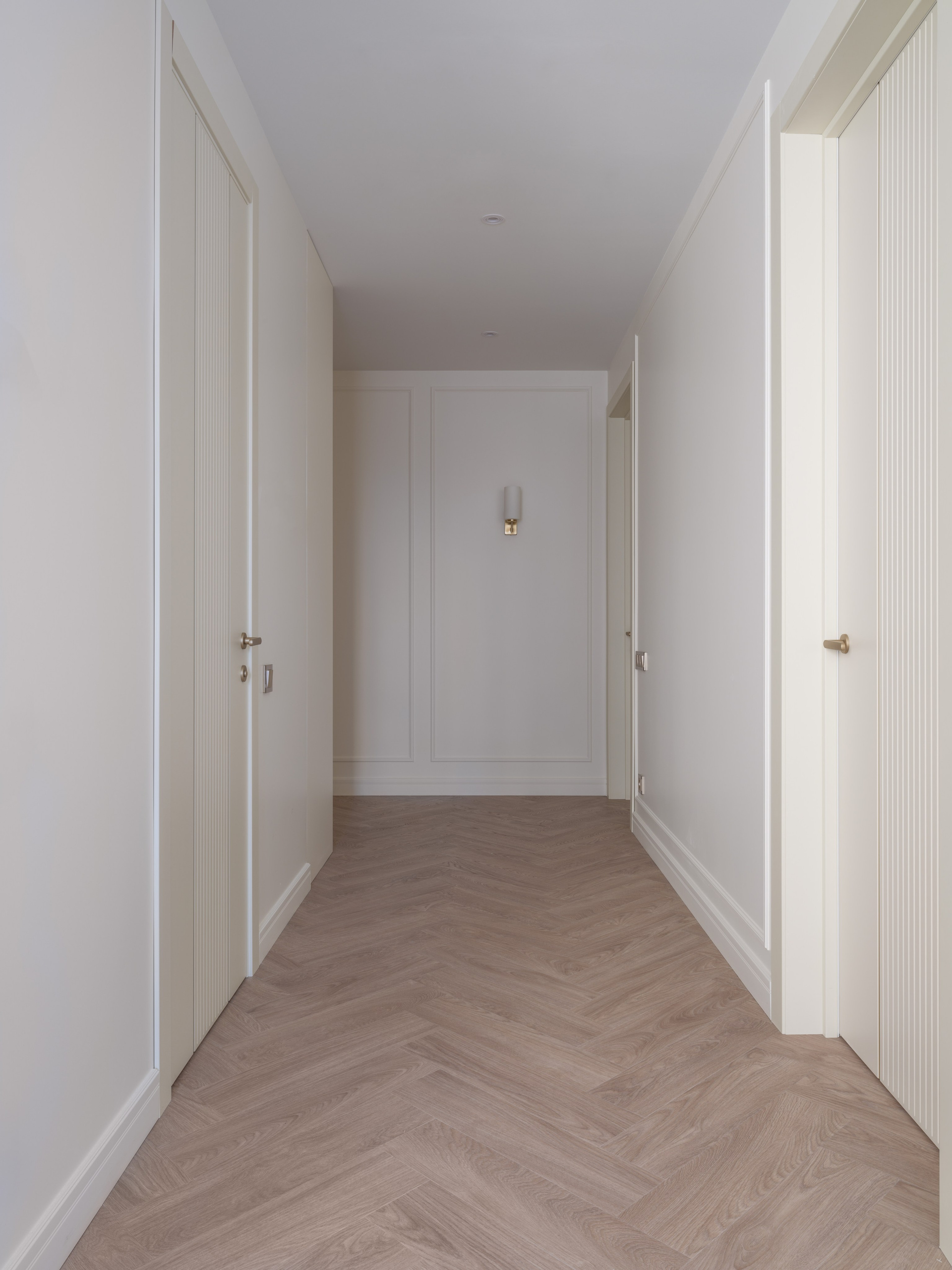 Были проведены все инженерные коммуникации; монтаж потолков из ГКЛ с подготовкой под покраску с врезкой трековых светильников и вент.решеток; стены были подготовлены под покраску по квалитету Q3; плинтуса и молдинги из дюрополимера под покраску; установка внутрипольных конвекторов; пол был выравнен в один уровень с с/узлами и уложен кварцвинил (в данном случае на Xtrafloor Flex Pro), облицовка трёх санузлов керамогранитом.