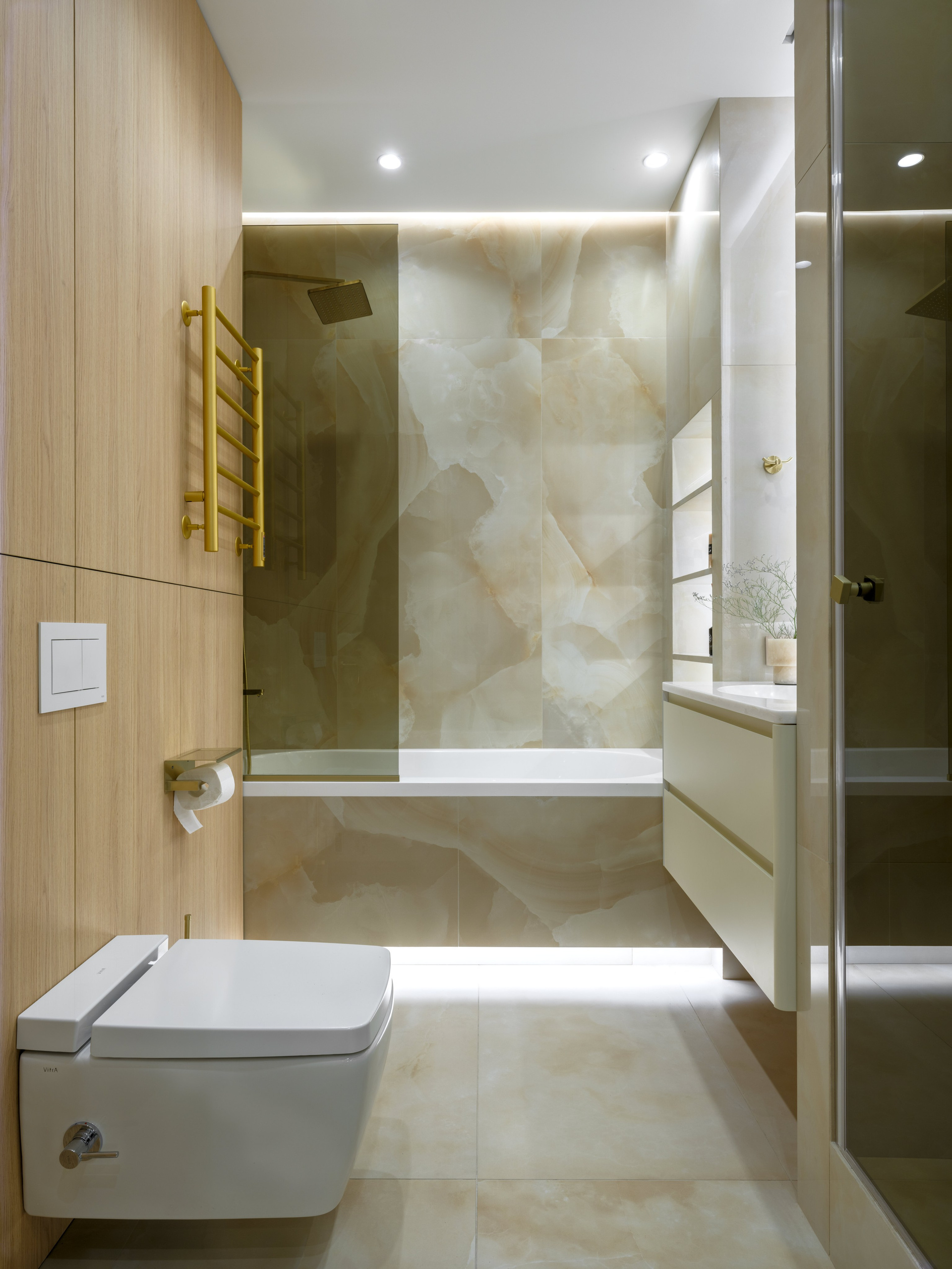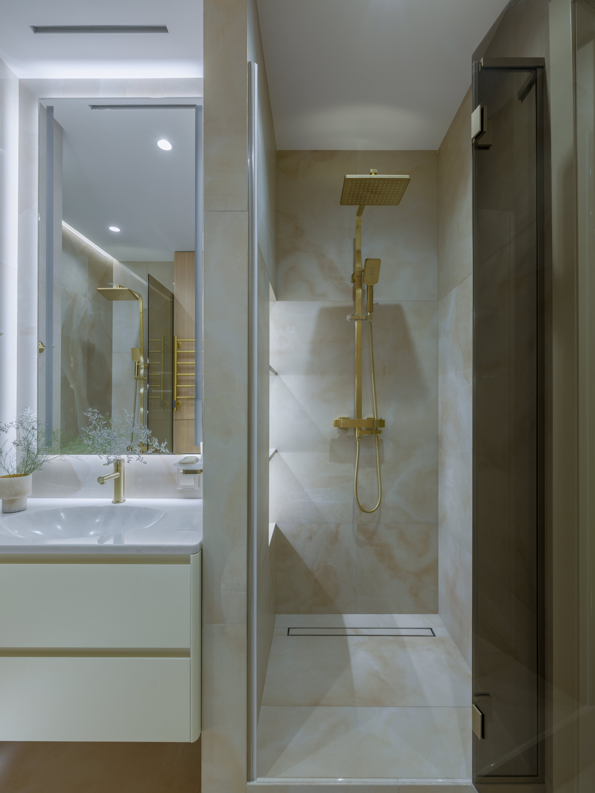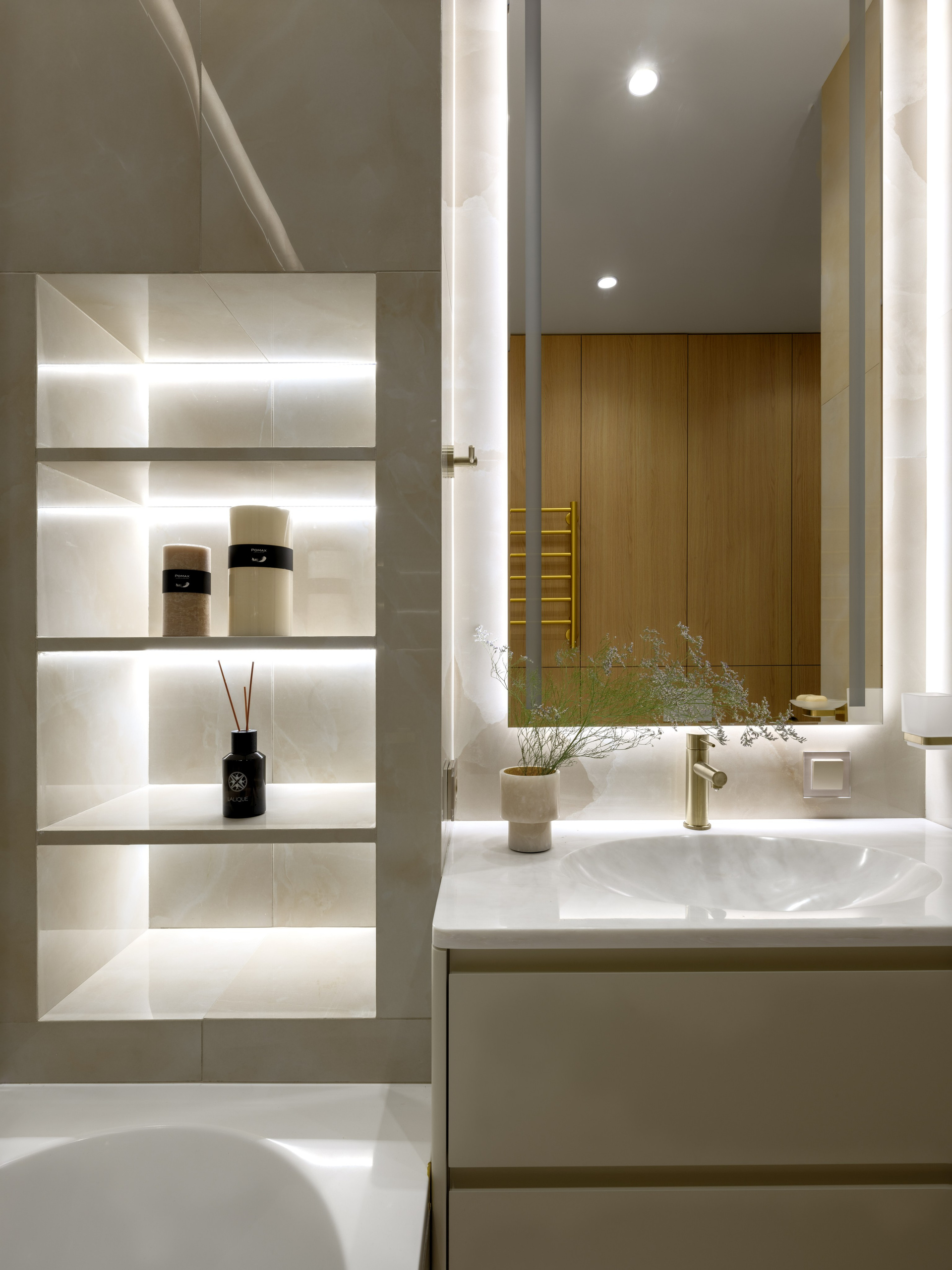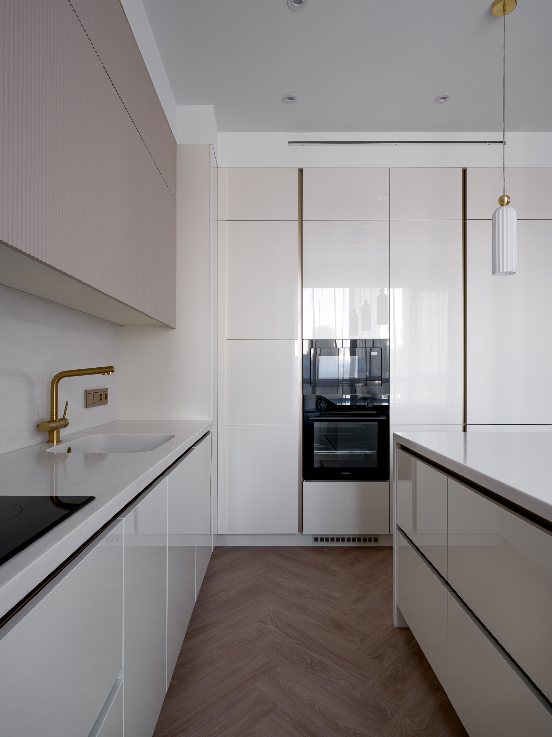 Были проведены все инженерные коммуникации; монтаж потолков из ГКЛ с подготовкой под покраску с врезкой трековых светильников и вент.решеток; стены были подготовлены под покраску по квалитету Q3; плинтуса и молдинги из дюрополимера под покраску; установка внутрипольных конвекторов; пол был выравнен в один уровень с с/узлами и уложен кварцвинил (в данном случае на Xtrafloor Flex Pro), облицовка трёх санузлов керамогранитом.