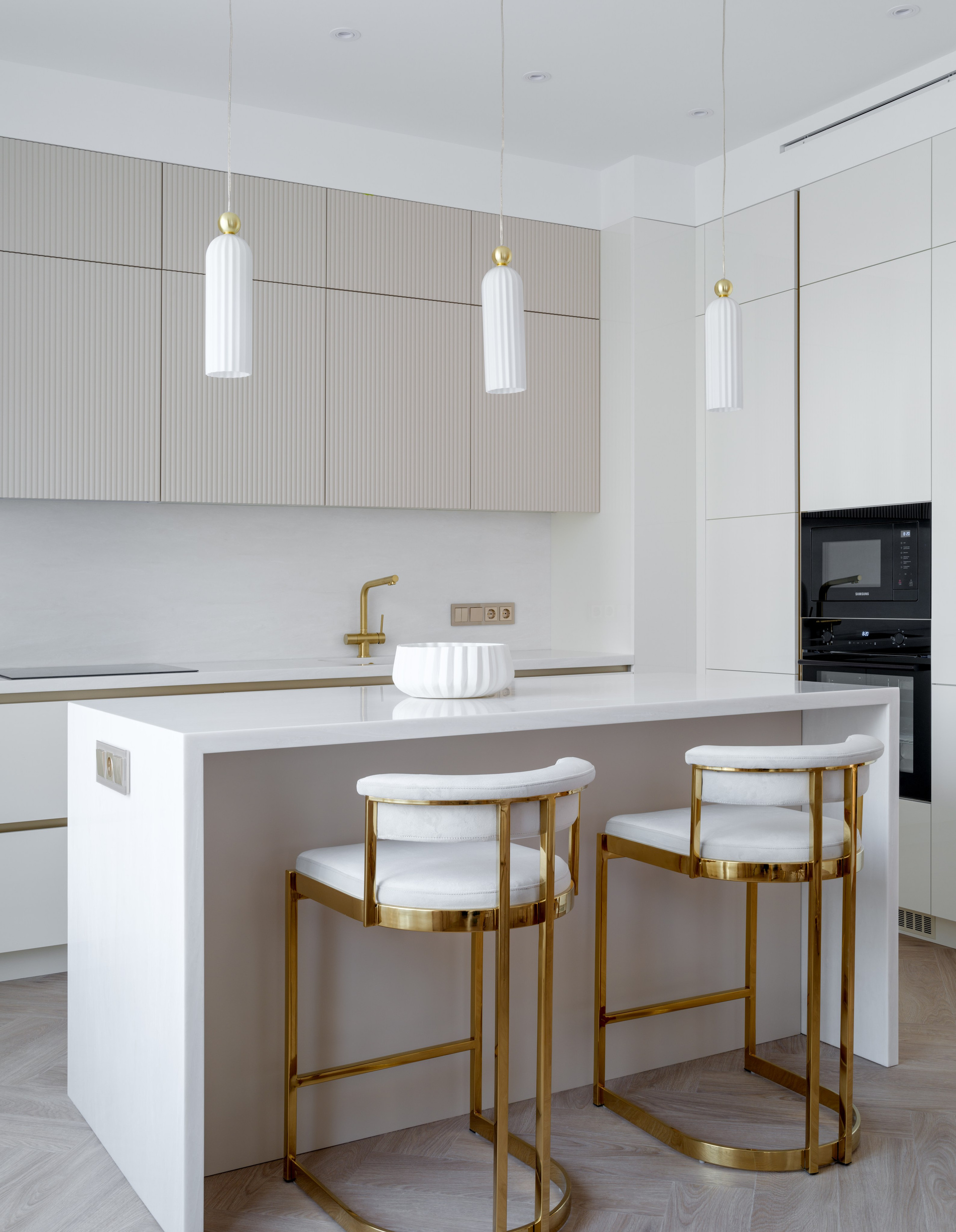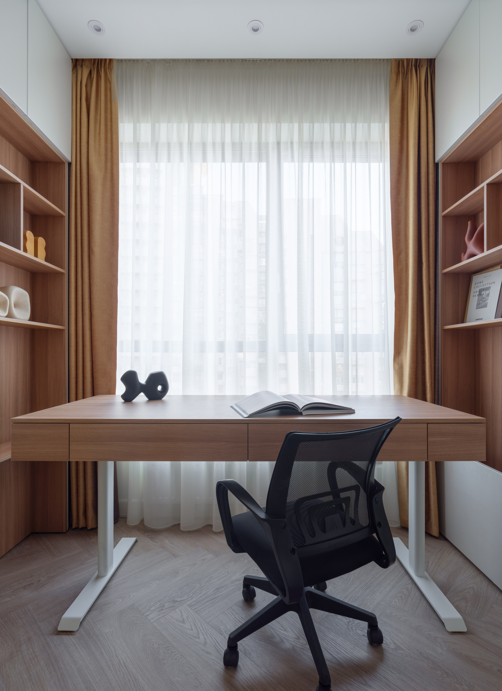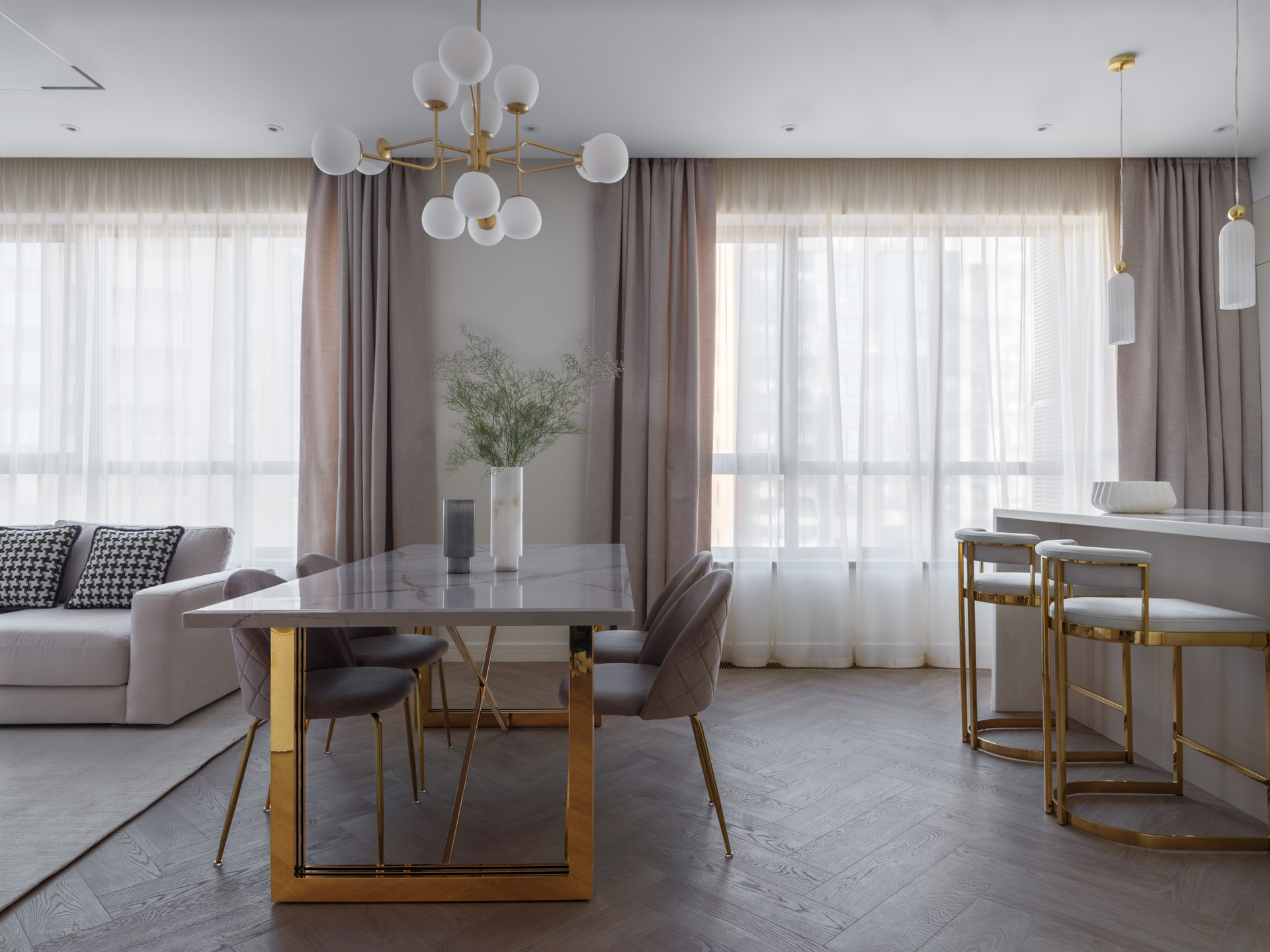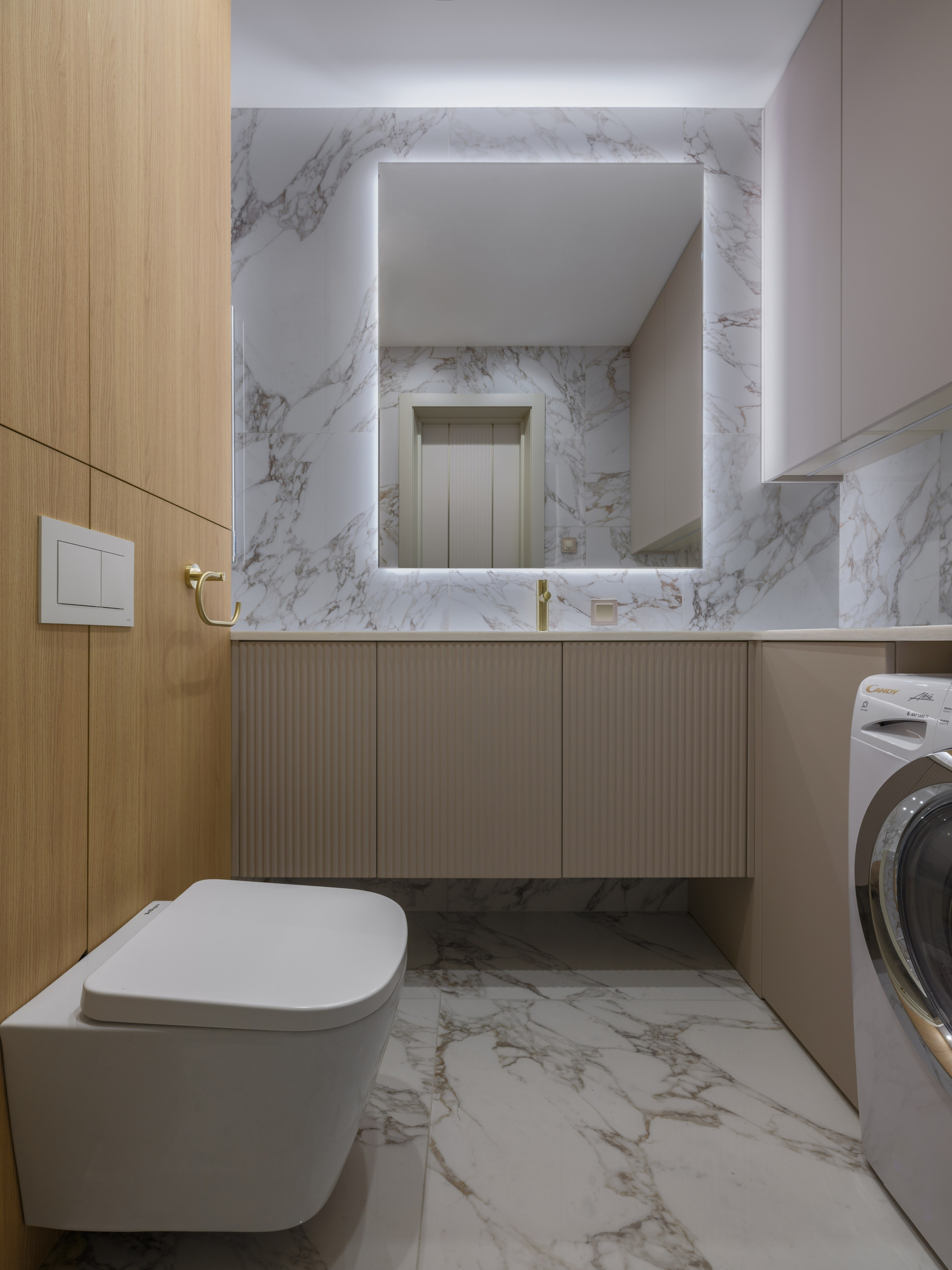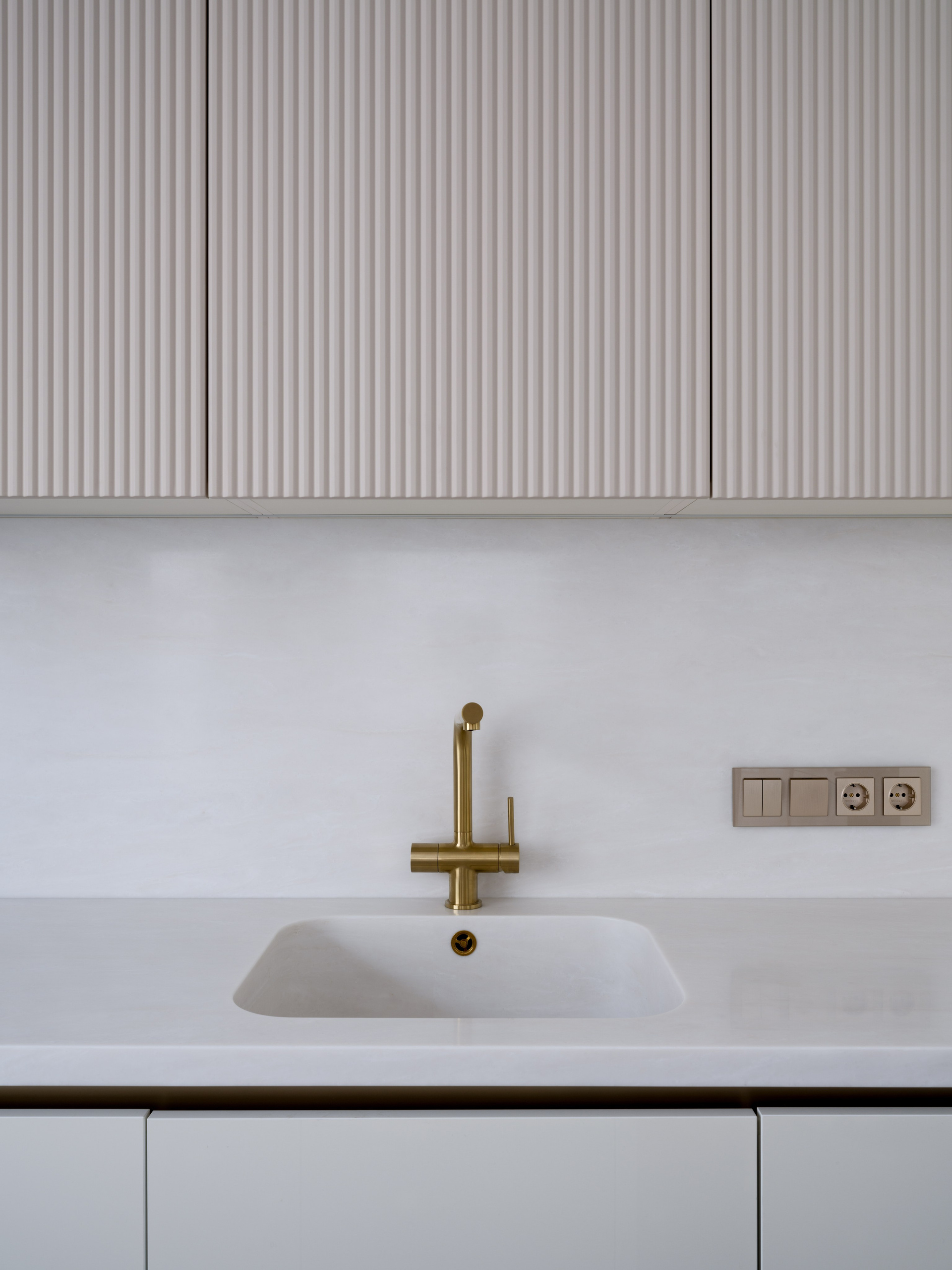 Были проведены все инженерные коммуникации; монтаж потолков из ГКЛ с подготовкой под покраску с врезкой трековых светильников и вент.решеток; стены были подготовлены под покраску по квалитету Q3; плинтуса и молдинги из дюрополимера под покраску; установка внутрипольных конвекторов; пол был выравнен в один уровень с с/узлами и уложен кварцвинил (в данном случае на Xtrafloor Flex Pro), облицовка трёх санузлов керамогранитом.